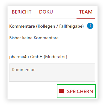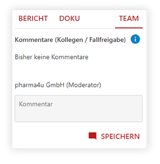 Hinweis: Über die Kommentarfunktion im Bereich “TEAM” im Ausgabeergebnis (s. unten) können alle Kolleg*innen, denen der Fall freigegeben wurde, die Kommentare der anderen mitverfolgen. Die Kommentare werden nicht in das PDF an Arzt / Ärztin oder Patient*in übernommen.