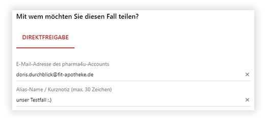 - Geben Sie zur Freigabe des Falles die E-Mail-Adresse des pharma4u-Accounts ein, mit dem Sie den Fall teilen möchten:
