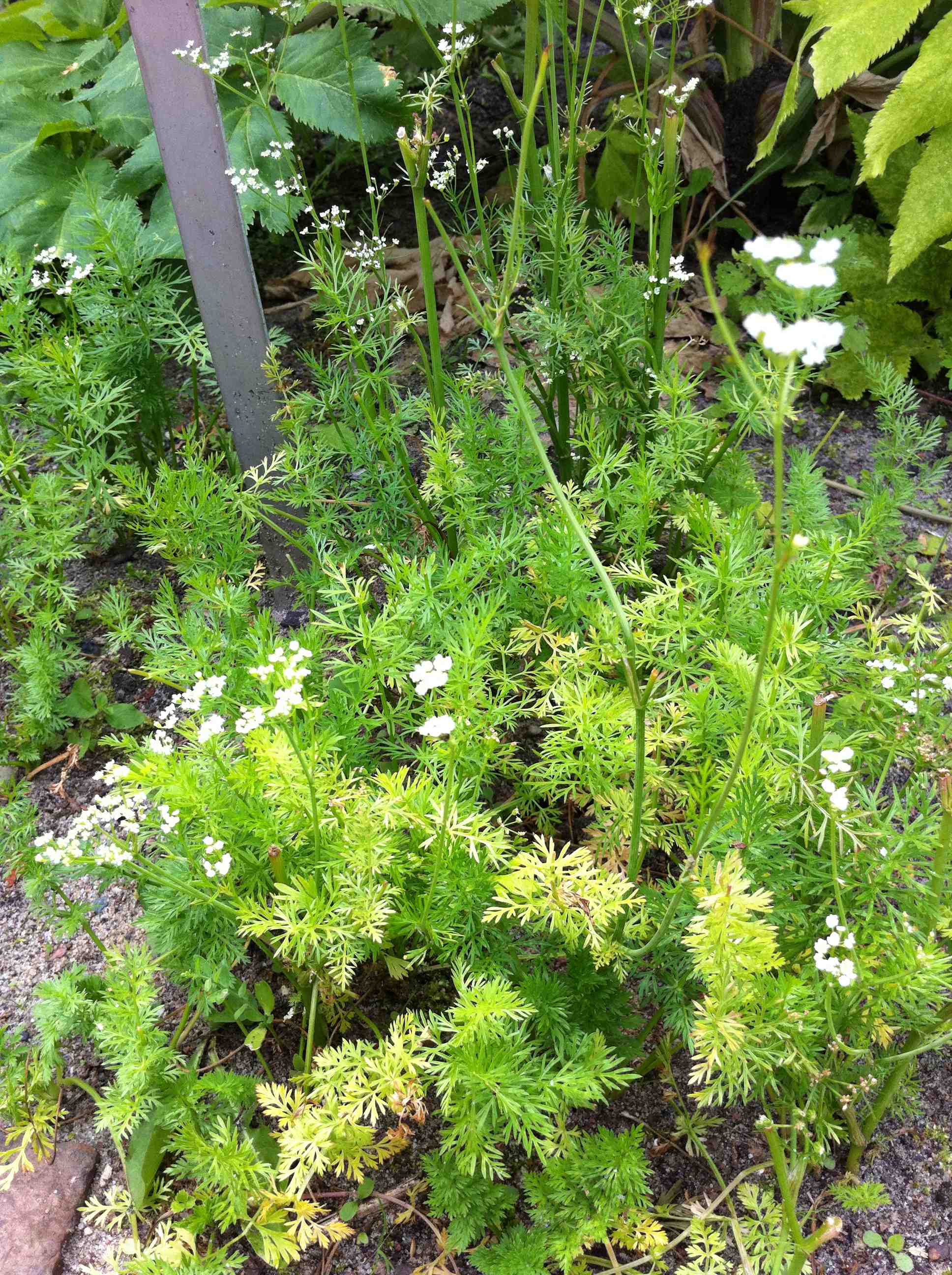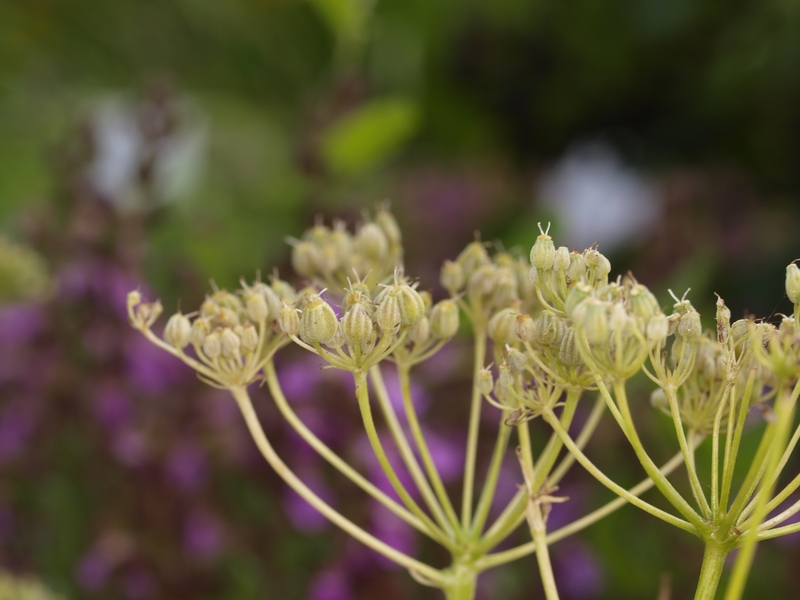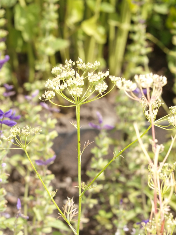 - Kleine weiße Blüten in meist 12-strahligen Doppeldolden