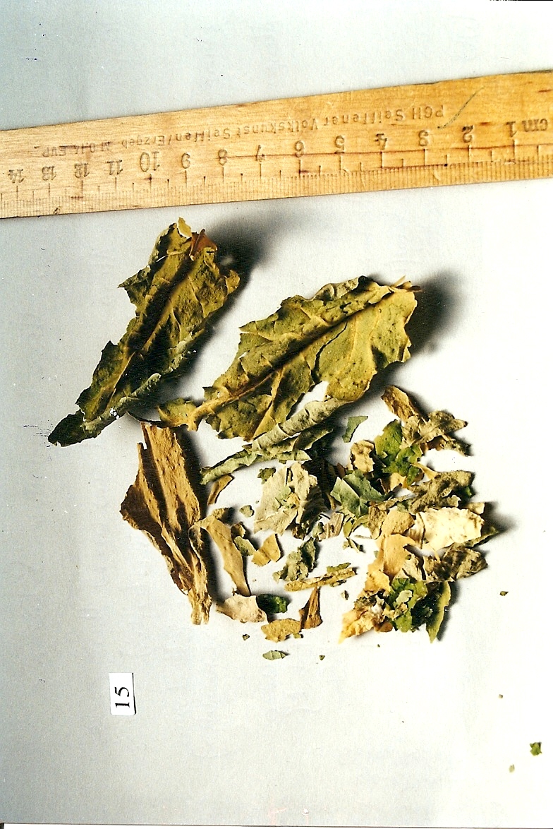 Mikroskopie: Kristallsandzellen; anisocytische Spaltöffnungen mit 3 bis 5 Nebenzellen; Bruchstücke von Drüsenhaaren (relativ selten)