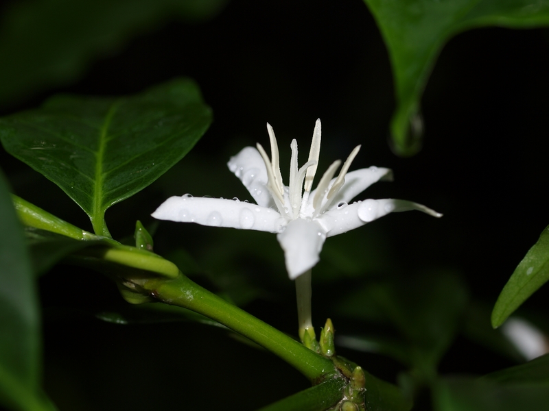 - Aus den weißen Blüten bilden sich die Kaffeekirschen, in reifem Zustand meist rot gefärbte Steinfrüchte