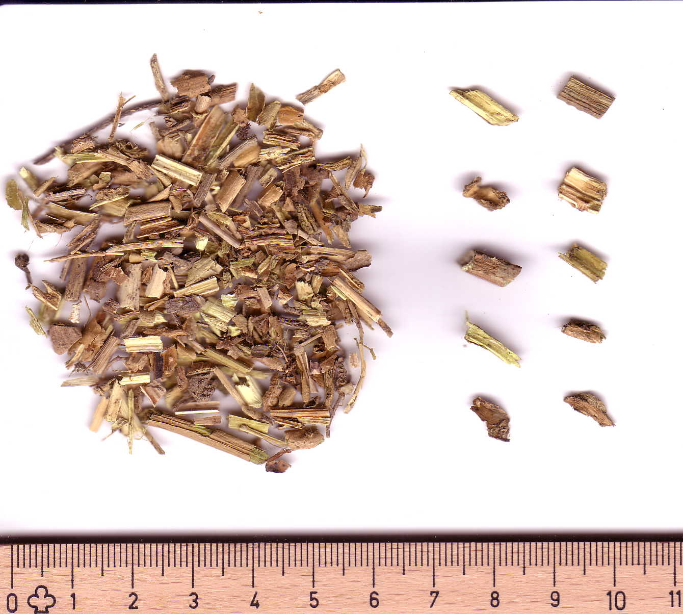 Allgemein: Getrocknete und geschnittene Sprossachsen des Strauches
