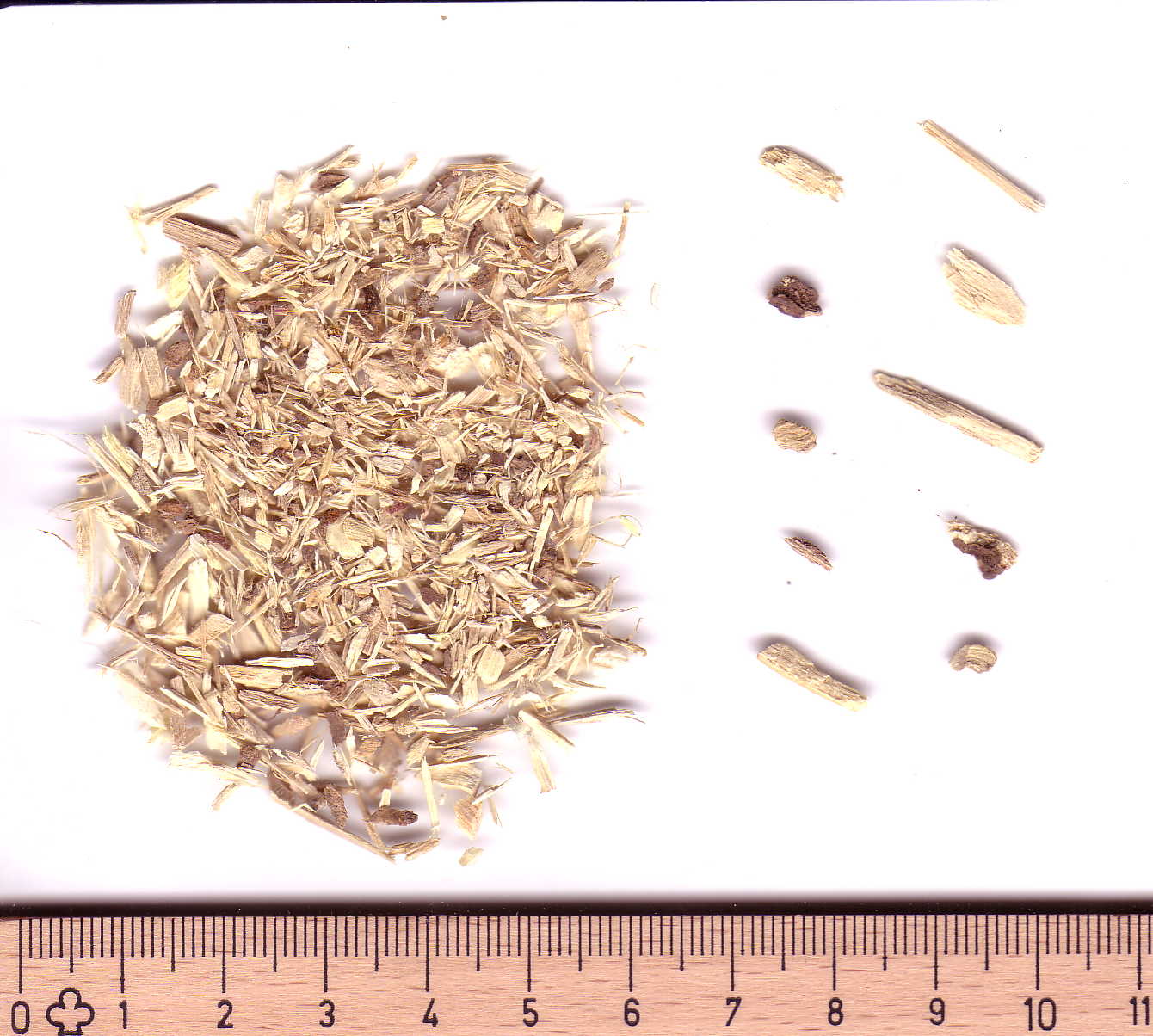 Allgemein: Bruchstücke von Rhizom und Wurzel (mitunter auch in Pulverform); Wurzeloberfläche ist graubraun bis schwarzbraun; die Oberfläche des Rhizoms ist von ähnlicher Farbe, allerdings rauer und längs gestreift. Schwach faseriger, im Holzbereich auch grobfaseriger Bruch.
