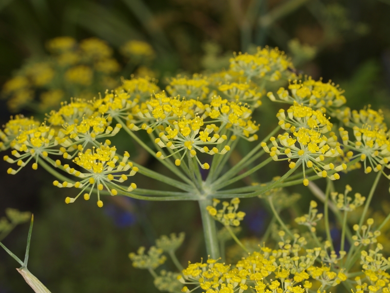 - Kleine gelbe Blüten in großen Doppeldolden, die zu den für die Apiaceae typischen Doppelachänen heranreifen