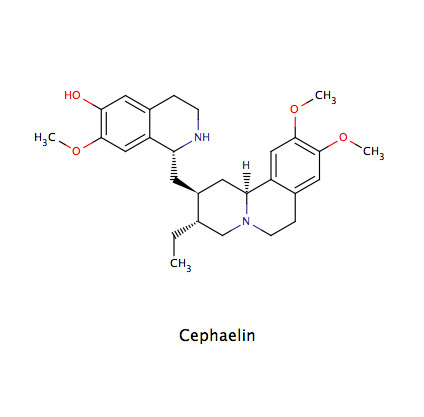 - Vier Hauptalkaloide: Emetin, Cephaelin (bei C. ipecacuanha im Verhältnis 2/3 und 1/3 vorliegend, bei C. acuminata 1/2 und 1/2 -> Unterscheidung!), Psychotrin und O-Methylpsychotrin