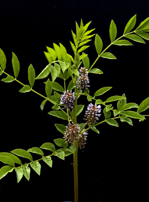 - Bläulich-violette und weiße Schmetterlingsblüten in kurzen, aufrechten Ähren