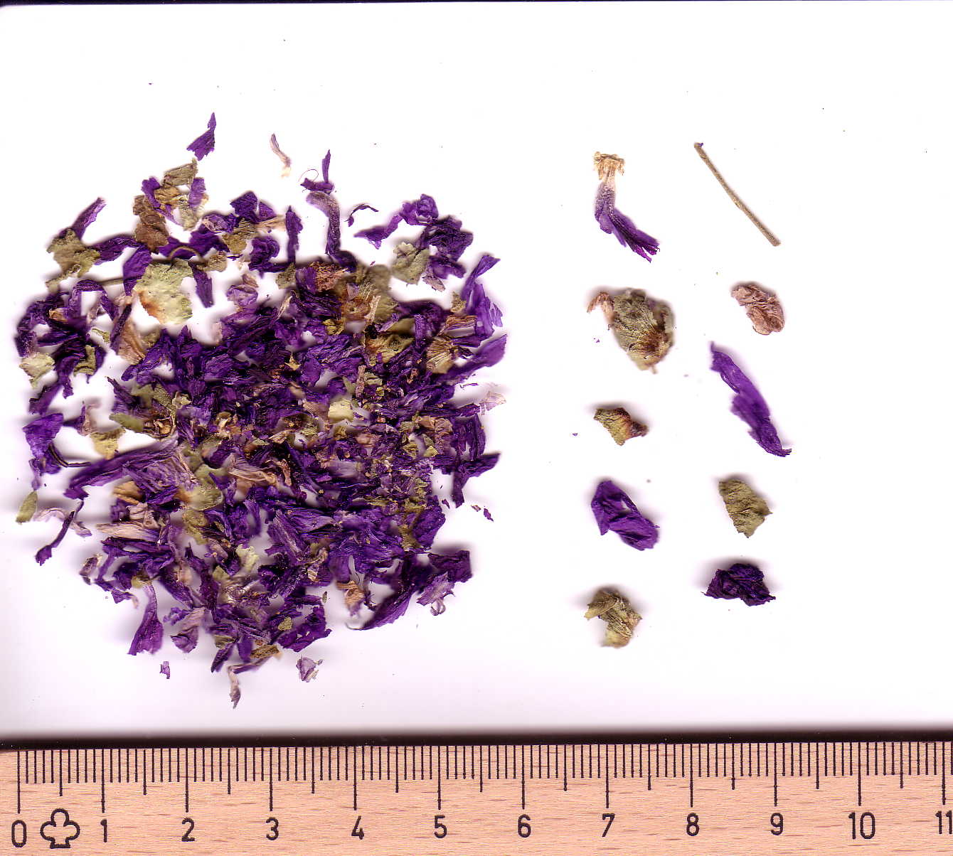 Allgemein: Borstig behaart Calyx; fünf ovale, hell- bis dunkelviolette Kronblätter. Die zahlreiche Staubblätter zu einer Röhre (= Columna) verwachsen, der Griffel trägt 10 fadenförmige Narben von ebenfalls violetter, häufig jedoch kontrastierender Farbe. Die Droge weist einen ausgeprägt schleimigen Geschmack auf.