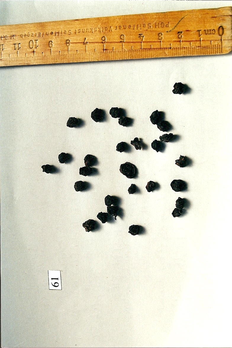 Allgemein: Reife, getrocknete, geschrumpfte, kugelige, blauschwarz gefärbte Beeren (teilweise mit Stiel); im fleischigen Mesokarp finden sich kleine, rötlichbraune Samen.