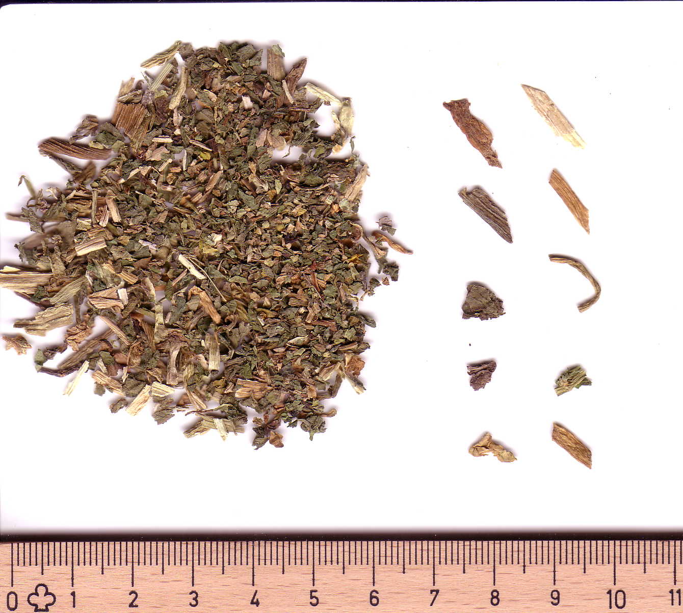 Allgemein: Blätter- & Stängelstückchen, weißlichgelbe Blüten und deren Fragmente sowie Schötchen mit kleinen hellbraunen Samen