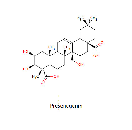 - 8-10% eines aus mindestens acht verschiedenen Glykosiden bestehenden Triterpensaponingemisches, die sich alle vom Aglykon Presenegenin ableiten