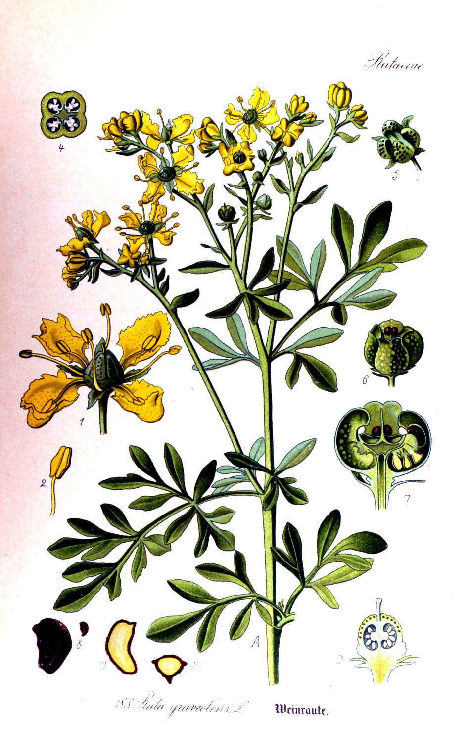 Allgemein: Die vor dem Aufblühen der Pflanze gesammelten krautigen Teile von Ruta graveolens; CAVE: nicht mehr offizinell!