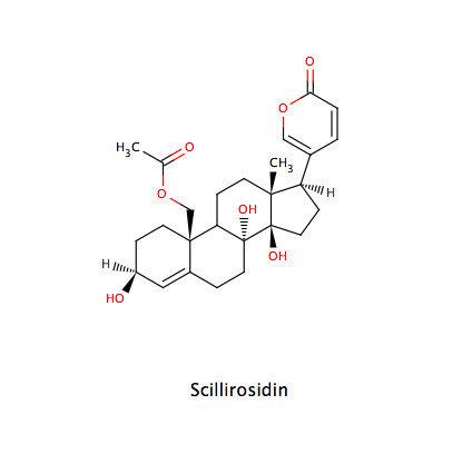 → Hauptglykoside: Glucoscillaren A, Scillaren A und das daraus durch Scillarenase-Spaltung entstandene Proscillaridin A (Aglykon: Scillarenin) - Rote Varietät → Hauptglykosid Scillirosid (Aglykon: Scillirosidin)