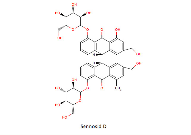 - > 2,5% Dianthron-8,8-diglucoside: Sennosid A und B ("Homodianthrone") sowie C und D ("Heterodianthrone")