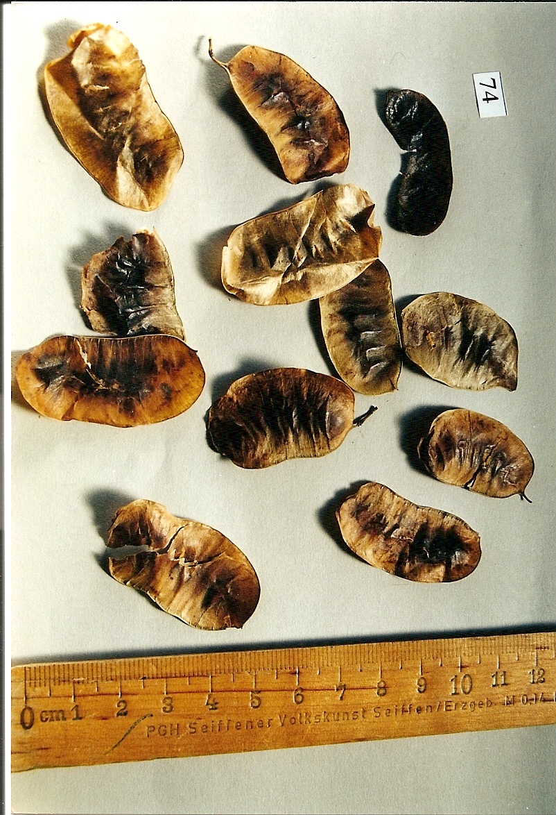 - Zylindrische, abgeflachte und holzig Hülsenfrüchte; öffnen sich zur Reife nicht