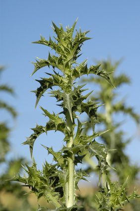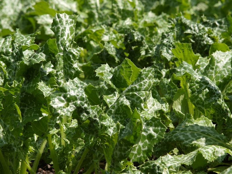 - Große, grünweiß marmorierte Blätter; dornig gezähnt