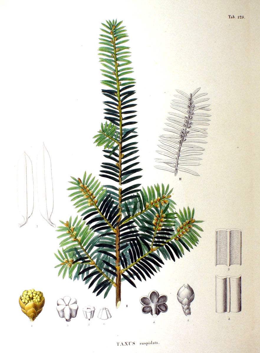 Pflanze: Taxus baccata, T. brevifolia, T. cuspidata / Europäische (Syn. Gemeine) Eibe, Pazifische Eibe, Japanische Eibe
